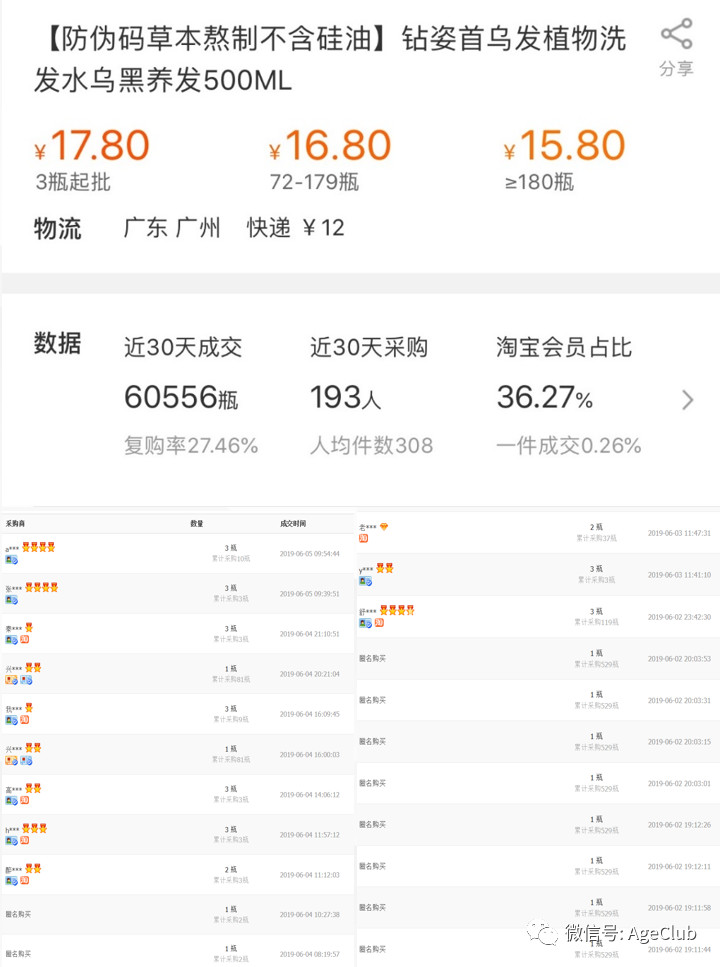 鉆姿是頭發(fā)護(hù)理品類里市場份額最高的品牌,達(dá)到38%。從鉆姿洗發(fā)水在1688.com的銷售情況和成交記錄來看,單瓶價格最低15.8元,與淘寶主力價格段68-89元有很大價差;且成交記錄中有很多是1-3瓶為單位銷售的,很可能是微商慣用的一件代發(fā)模式。