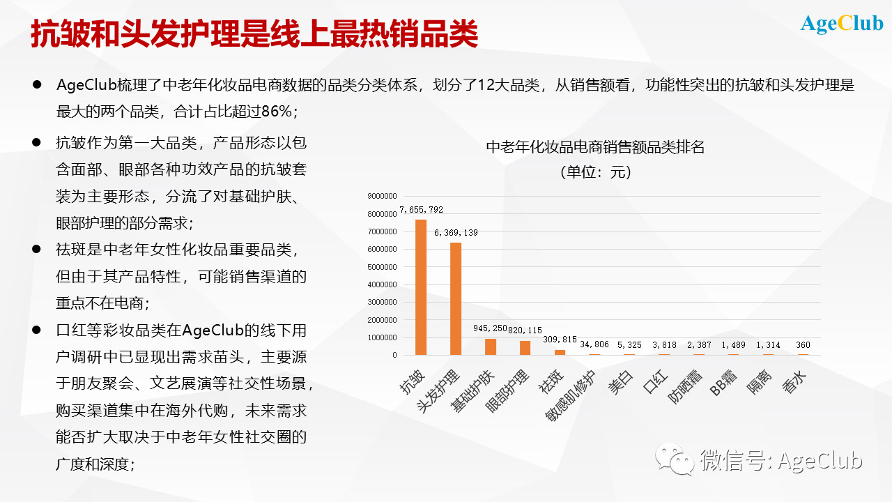 其實(shí)線下調(diào)研得到的結(jié)果和線上電商數(shù)據(jù)有一些不一樣。在我們6月份發(fā)布的中老年化妝品電商報(bào)告中曾指出,功能性的化妝品品類是線上銷售的主流,在數(shù)據(jù)覆蓋的銷售額中,抗皺和頭發(fā)護(hù)理兩大品類占比達(dá)到86%。