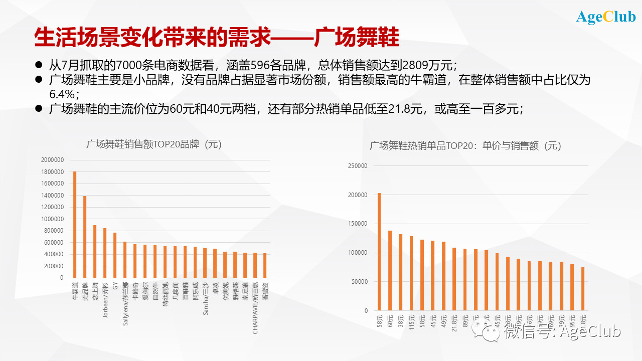 比如廣場(chǎng)舞鞋,這個(gè)產(chǎn)品純粹是靠著中老年女性最喜愛(ài)的廣場(chǎng)舞而帶火的。最近我們抓取了廣場(chǎng)舞鞋的數(shù)據(jù),從這7000條電商數(shù)據(jù)看,涵蓋596個(gè)品牌,總體銷售額達(dá)到2809萬(wàn)元。