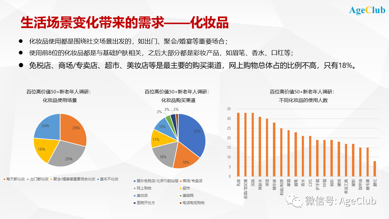 在AgeClub的北京百位高價(jià)值50+新老年人深度調(diào)研中體現(xiàn)得很清楚,有76%的老人是每天化妝或者出門(mén)和聚會(huì)/婚宴等重要場(chǎng)合化妝;