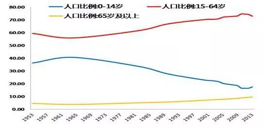 65歲以上老年人占總?cè)丝诘谋壤龔?%提升到14%,發(fā)達(dá)國家大多用了45年以上的時間。中國只用27年就可以完成這個歷程,并且將長時期保持很高的遞增速度,屬于老齡化速度最快國家之列。預(yù)計到2045年左右,中國60歲以上人口將占到總?cè)丝诘?0%。該過程發(fā)達(dá)國家用了100年。圖2為1953年到2013年60年的人口比例變化情況,中國的高齡化趨勢明顯。