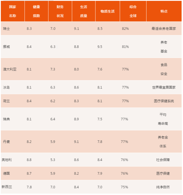 法盛全球資產(chǎn)管理公司(Natixis Global Asset Management),根據(jù)世界銀行、世界衛(wèi)生組織等提供的數(shù)據(jù),從醫(yī)療環(huán)境、預(yù)期壽命、金融穩(wěn)定和生活質(zhì)量等20個方面,綜合比較了全球150個國家的養(yǎng)老情況,評出了前十名: