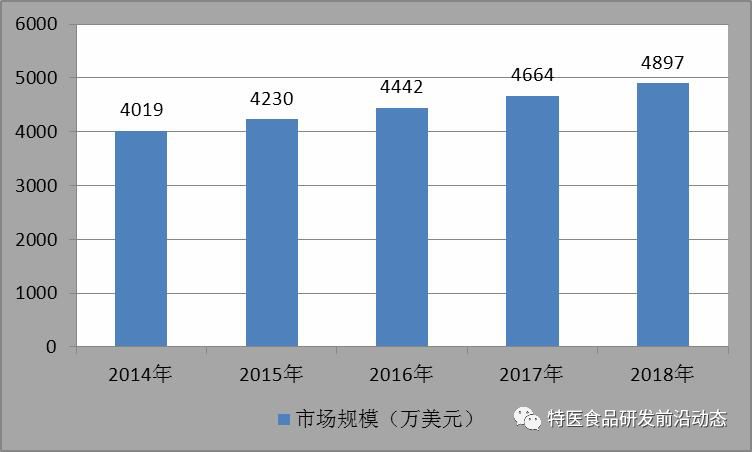 圖表6:2014-2018年澳大利亞和新西蘭特醫(yī)食品市場(chǎng)規(guī)模(單位:萬美元)