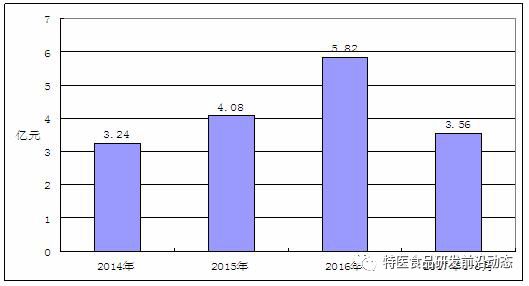 截止2017年6月,我國特醫(yī)食品行業(yè)總產(chǎn)值在3.56億元左右,同比增長35.2%。