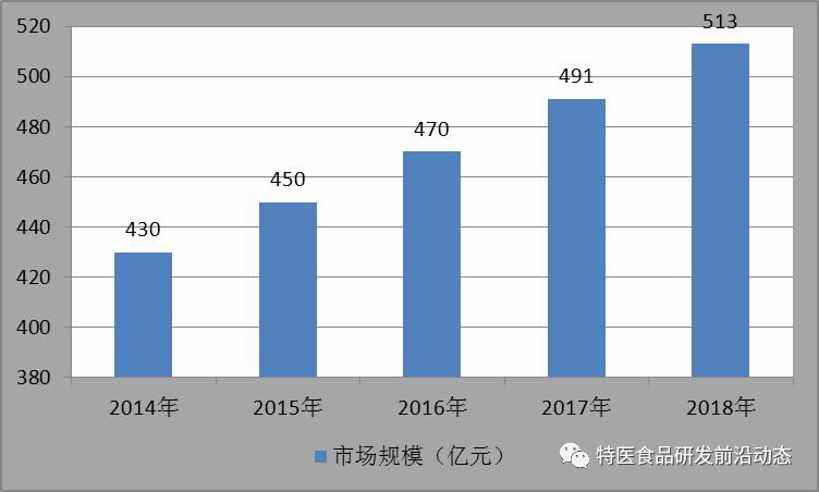 圖表1:2014-2018年特醫(yī)食品市場(chǎng)規(guī)模(單位:億元)