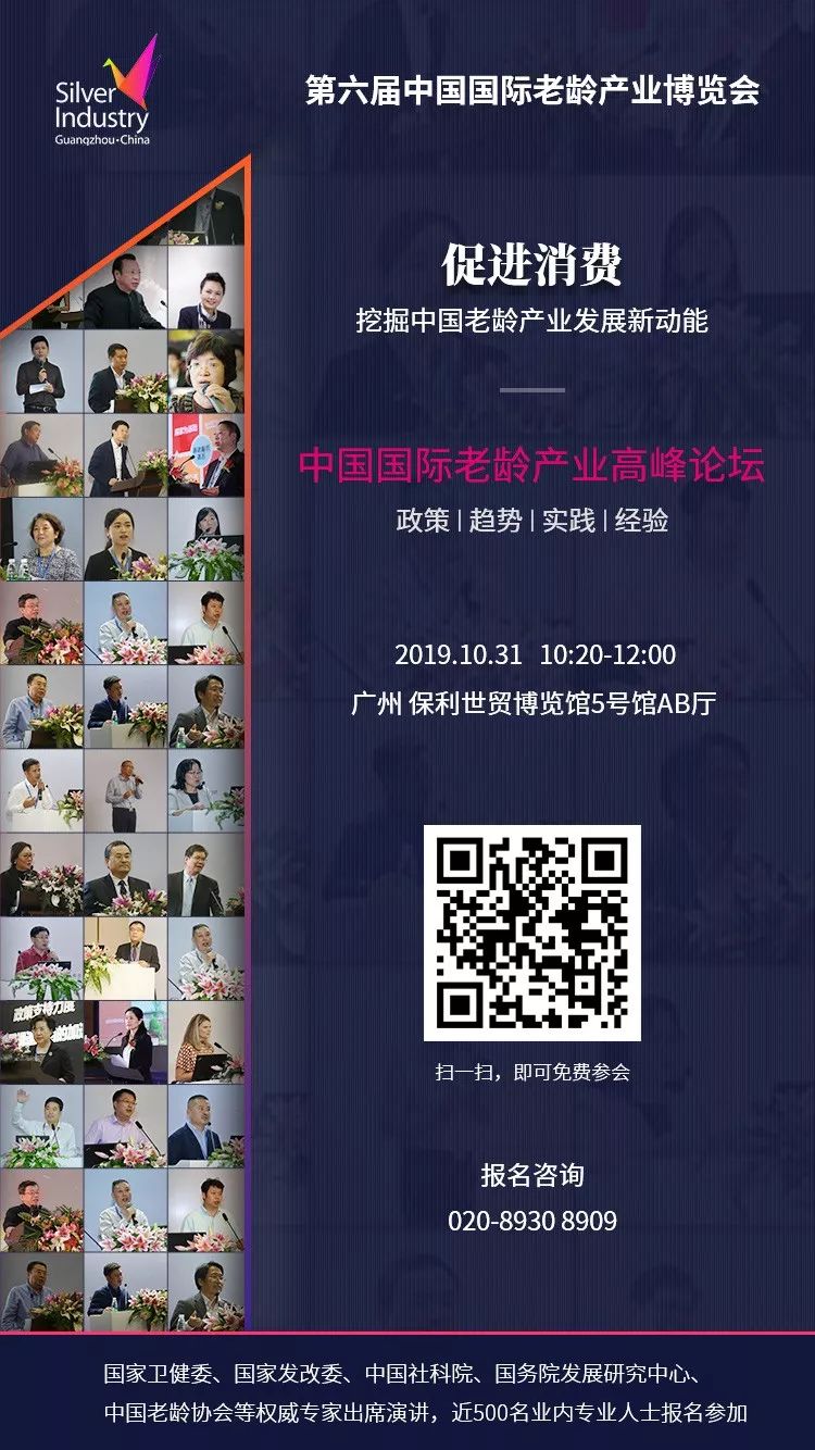 10月31日廣州,民政部、發(fā)改委、衛(wèi)健委、中國社科院、中國老齡產(chǎn)業(yè)協(xié)會等權(quán)威部門將出席第六屆廣州SIC老博會主論——“促進(jìn)消費(fèi),挖掘中國老齡產(chǎn)業(yè)發(fā)展新動(dòng)能“中國國際老齡產(chǎn)業(yè)高峰論壇,解讀產(chǎn)業(yè)政策和趨勢,交流行業(yè)實(shí)踐與經(jīng)驗(yàn)。歡迎提前約定席位。