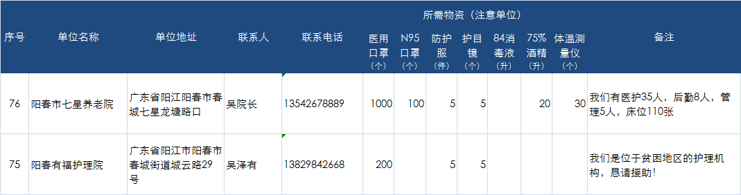 據(jù)公眾號“健康養(yǎng)老頻道(SICnews)”、“阿沐養(yǎng)老(MorHome)”、“永愛養(yǎng)老(gdong-ai)”等渠道相關(guān)消息,目前已有76家養(yǎng)老(醫(yī)養(yǎng))機構(gòu)發(fā)布防護物資需求,詳情見后。