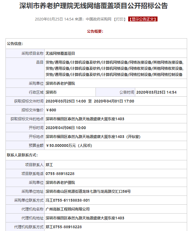預(yù)算50萬,深圳市養(yǎng)老護(hù)理院無線網(wǎng)絡(luò)覆蓋項(xiàng)目公開招標(biāo)公告