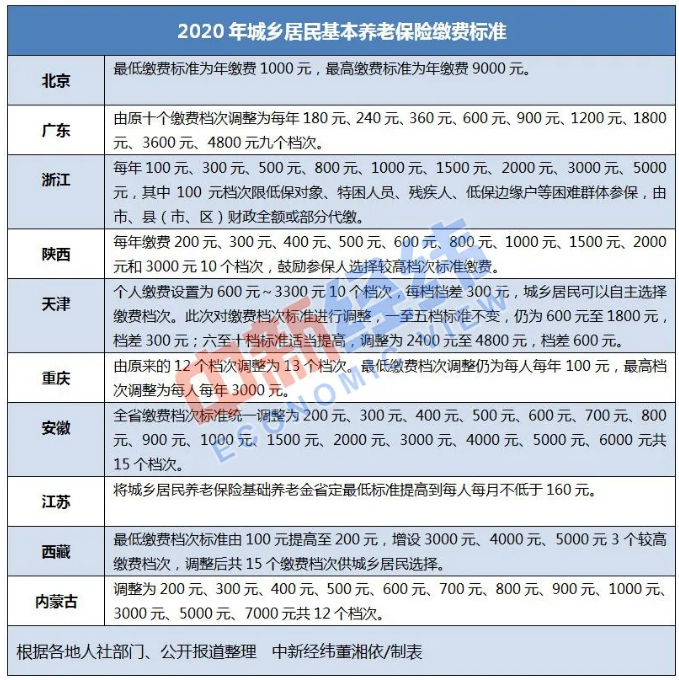從2020年1月1日起,北京、廣東、浙江、陜西、天津、重慶、安徽、江蘇、西藏、內(nèi)蒙古等省區(qū)市,已實(shí)施新修訂的城鄉(xiāng)居民基本養(yǎng)老保險(xiǎn)實(shí)施方案,多地調(diào)整了個(gè)人繳費(fèi)檔次標(biāo)準(zhǔn),提高了繳費(fèi)上限。