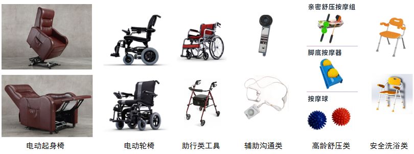 個(gè)人生活自理及防護(hù)輔助器具、個(gè)人移動(dòng)輔助器具、家庭和其他場(chǎng)所的家具和適配件、信息溝通輔助器具、個(gè)人醫(yī)療輔助器具、休閑娛樂(lè)輔助器具。