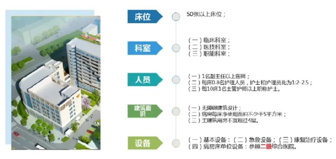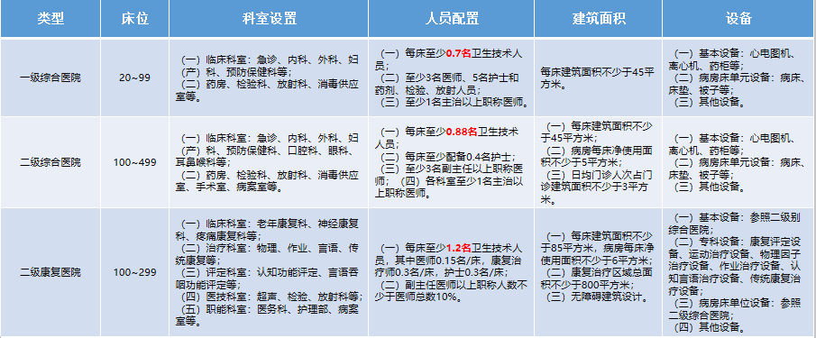 一是??漆t(yī)院院名可以康復(fù)醫(yī)院為主,從床位、科室到人員、建筑面積以及設(shè)備都有明確的規(guī)定,以一級康復(fù)醫(yī)院為例: