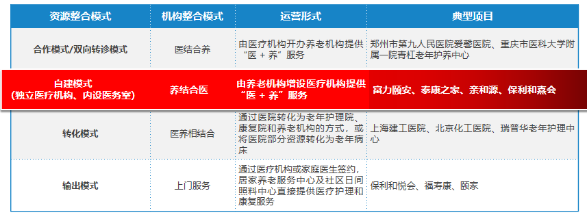 結(jié)合各地開展的醫(yī)養(yǎng)結(jié)合實踐案例,從資源整合維度來看,可以分為合作模式或雙向轉(zhuǎn)診模式、自建模式、轉(zhuǎn)化模式和輸出模式等;從機構(gòu)整合維度來看,可以分為醫(yī)結(jié)合養(yǎng)、養(yǎng)結(jié)合醫(yī)、醫(yī)養(yǎng)相結(jié)合、上門服務(wù)等四種類型或模式。