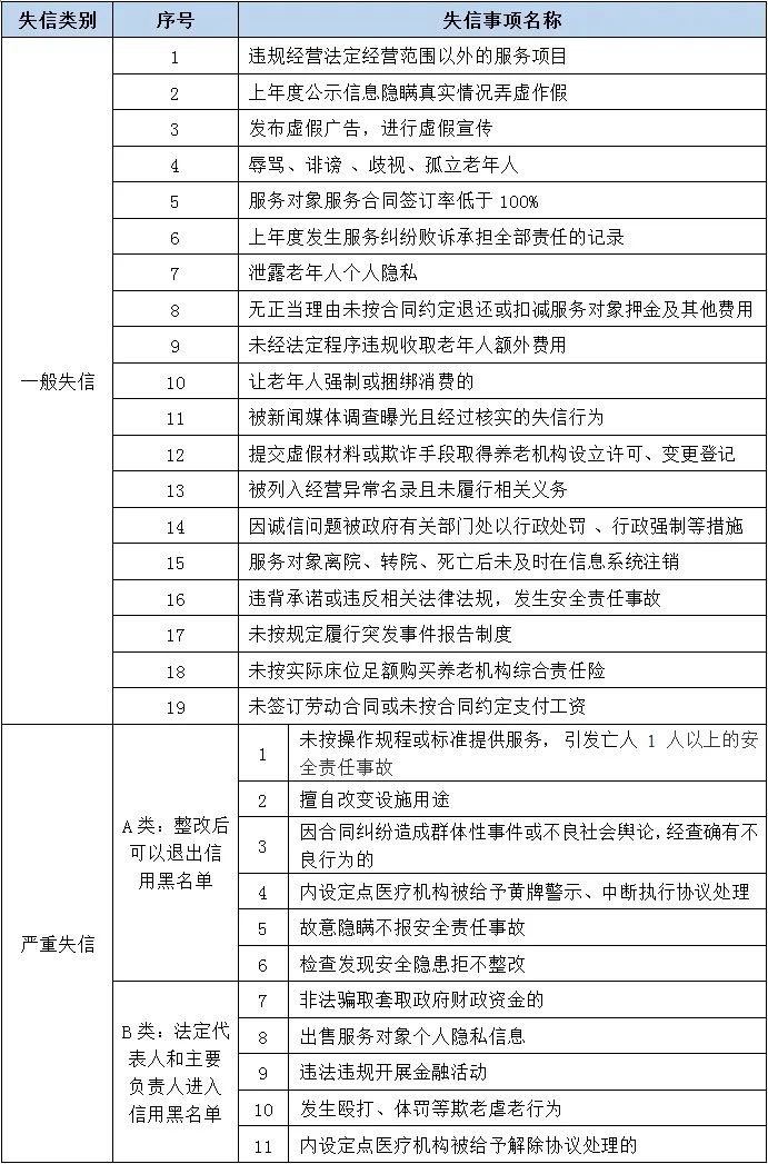 2018年年底,北京市民政局發(fā)布《北京市養(yǎng)老服務(wù)機(jī)構(gòu)信用信息管理使用辦法》,其中明確規(guī)定了19項(xiàng)一般失信行為和11項(xiàng)嚴(yán)重失信行為。嚴(yán)重失信行為一旦被判定,將直接列入北京市養(yǎng)老服務(wù)機(jī)構(gòu)信用黑名單。