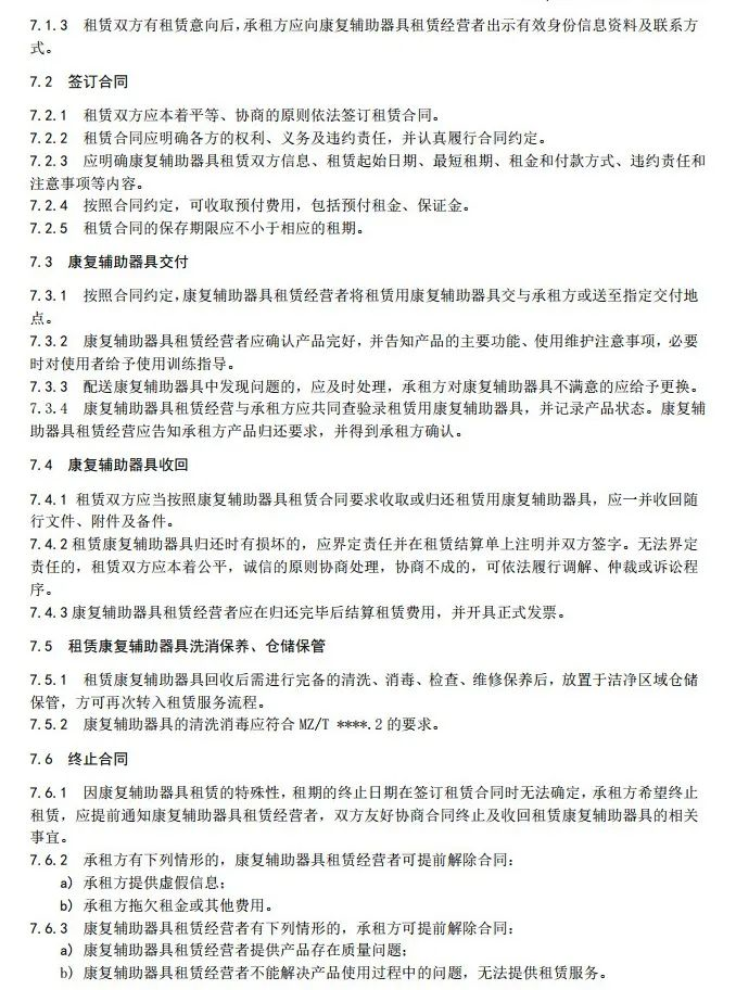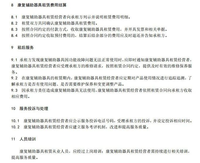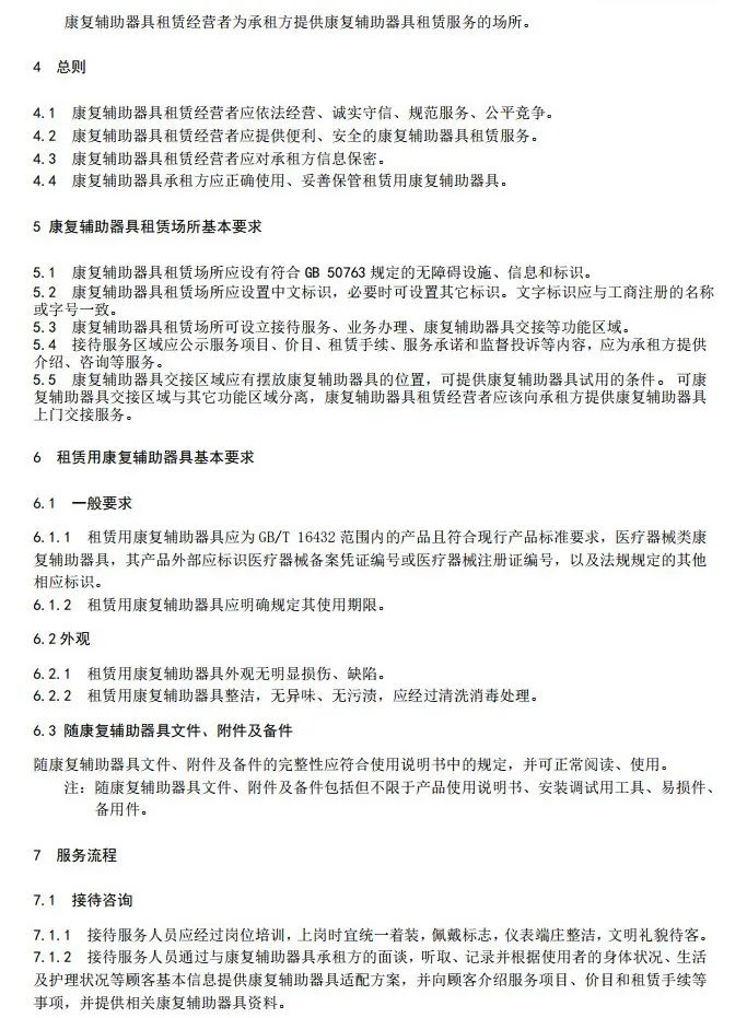 該意見稿從租賃場所、租賃用康復(fù)輔具、服務(wù)流程、租賃費用結(jié)算、租后服務(wù)、投訴與處理、人員培訓(xùn)等7個方面規(guī)定了康復(fù)輔具租賃服務(wù)的基本要求。
