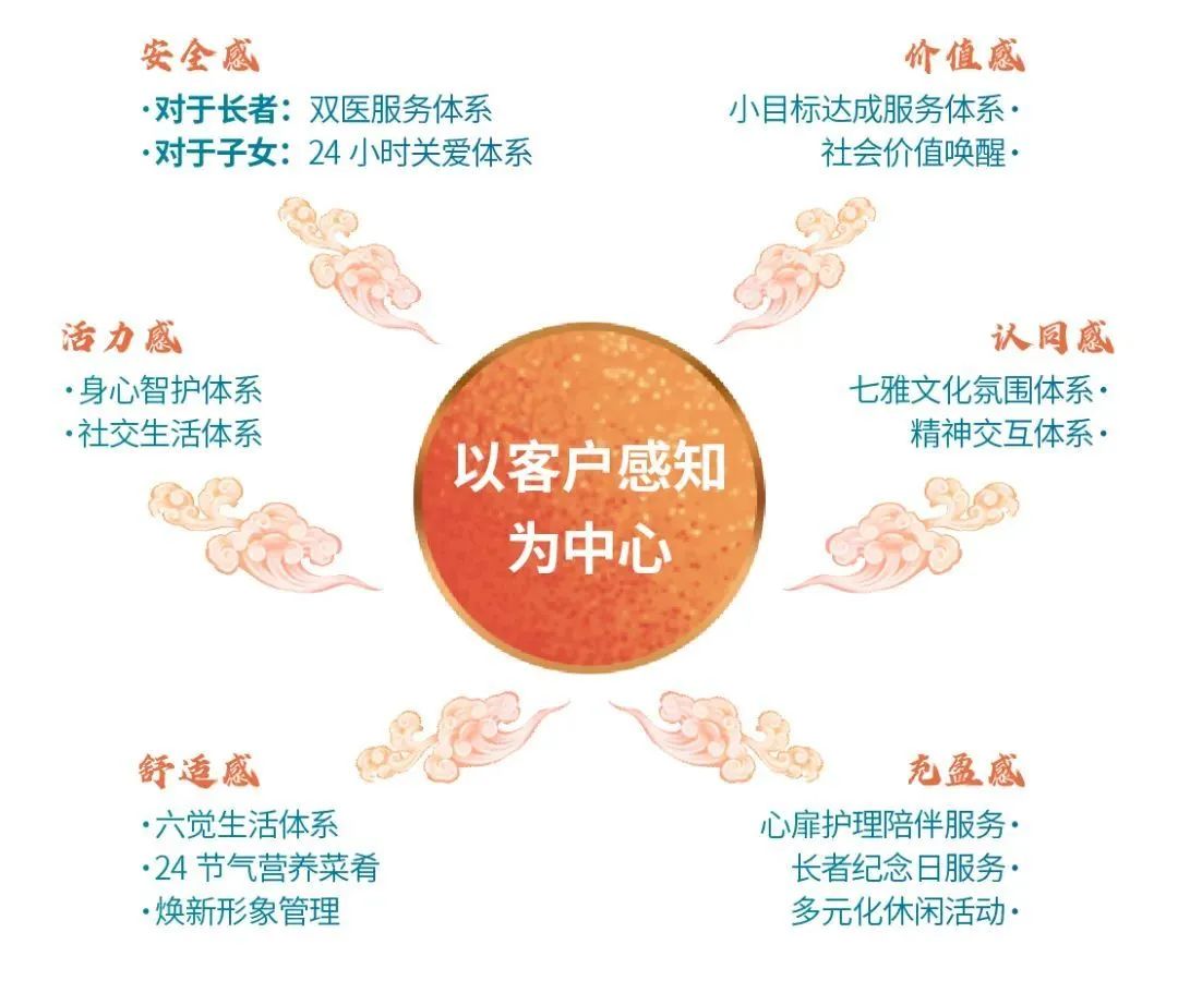 通過長(zhǎng)者六個(gè)感知維度,為長(zhǎng)者提供囊括舒適生活、健康管理、文化娛樂等方面,近130項(xiàng)品質(zhì)服務(wù)。