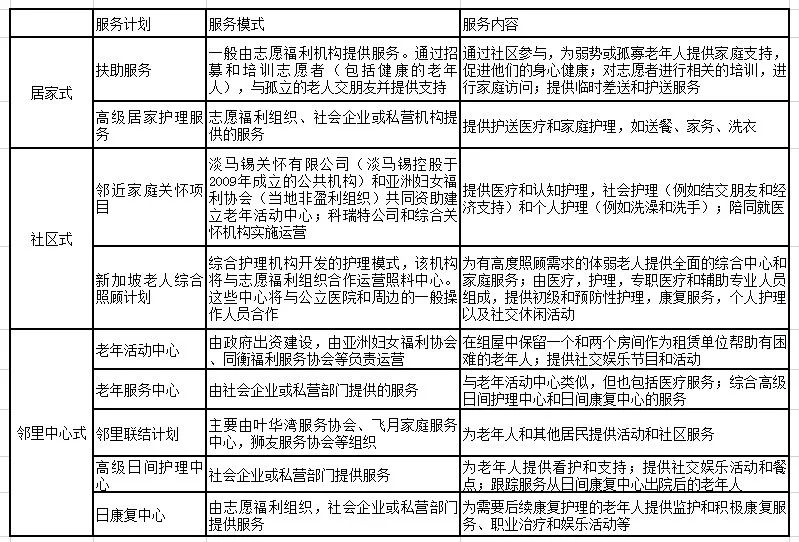 服務(wù)設(shè)施方面,在具體服務(wù)內(nèi)容上,新加坡討論的內(nèi)容基本圍繞醫(yī)療護(hù)理、日常家政、文體志愿等幾個(gè)方面。在適老改造項(xiàng)目分類上,新加坡的老年服務(wù)設(shè)施配置基于居民需求,按照需求程度和距離分類,分為三類:分別為提供居家扶助和醫(yī)護(hù)的居家式、提供醫(yī)療護(hù)理和其他社會(huì)支持的社區(qū)式、提供預(yù)防性的護(hù)理服務(wù)以及休閑娛樂服務(wù)的鄰里中心式。