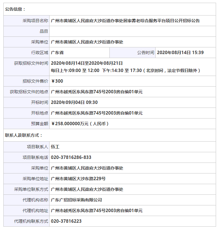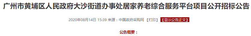 項目名稱:廣州市黃埔區(qū)人民政府大沙街道辦事處居家養(yǎng)老綜合服務平臺項目公開招標公告
