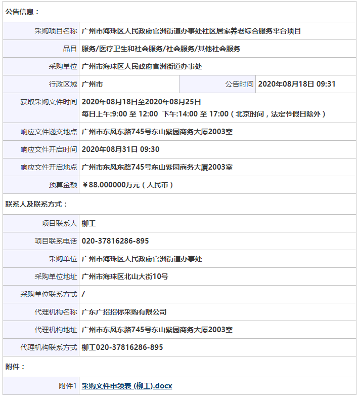 項目名稱:廣州市海珠區(qū)人民政府官洲街道辦事處社區(qū)居家養(yǎng)老綜合服務平臺項目