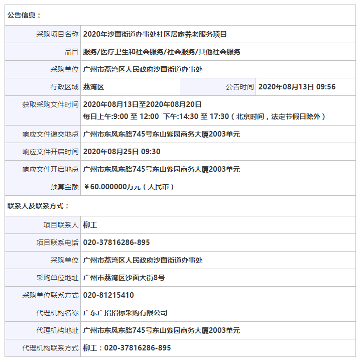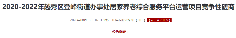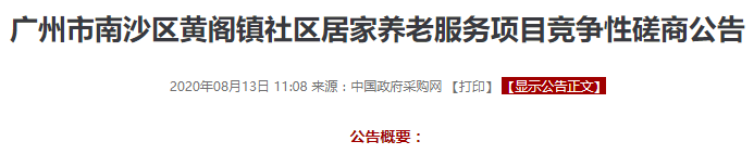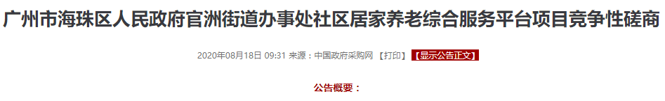 近期,中國政府采購網陸續(xù)發(fā)布廣州市5個社區(qū)居家養(yǎng)老項目采購公告,詳情如下: