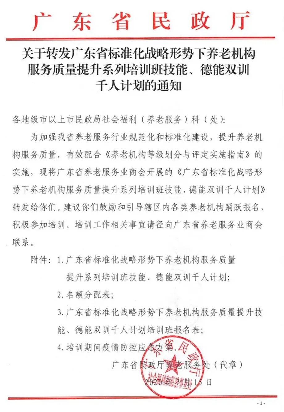 為加強我省養(yǎng)老服務(wù)行業(yè)規(guī)范化和標準化建設(shè),在省民政廳的指導(dǎo)下,廣東省養(yǎng)老服務(wù)業(yè)商會承辦自2019年起完成培訓(xùn)1350名管理人員的公益培訓(xùn)計劃,即“廣東省標準化戰(zhàn)略形勢下養(yǎng)老機構(gòu)服務(wù)質(zhì)量提升技能、德能雙訓(xùn)千人計劃院長班”。