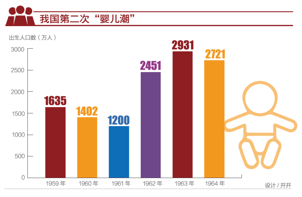 大家都知道,上世紀(jì)三年自然災(zāi)害結(jié)束后,我國(guó)迎來(lái)了第二次“嬰兒潮”。三年自然災(zāi)害的第一年、1959年我國(guó)出生人口是1635萬(wàn),1960年是1402萬(wàn),1961年下降到最低,是1200萬(wàn)。緊接著就是“嬰兒潮”,1962年是2451萬(wàn),1963年達(dá)到峰值2931萬(wàn),1964年是2721萬(wàn)。