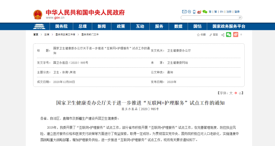 國家衛(wèi)生健康委辦公廳關于進一步推進“互聯(lián)網(wǎng)+護理服務”試點工作的通知