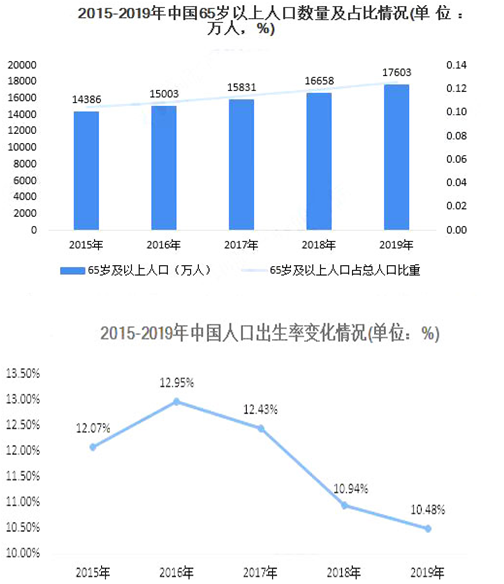 目前,我國的老年人口數(shù)量持續(xù)上升、人口出生率持續(xù)降低,人口老齡化趨勢較為明顯。數(shù)據(jù)顯示,2019年,我國65歲以上人口數(shù)量為1.76億人,占總?cè)丝诒戎?2.57%,這一比例相較于2018年提升0.64個(gè)百分點(diǎn)。同年,人口出生率下為10.48%,較2018年下降0.46個(gè)百分點(diǎn)。