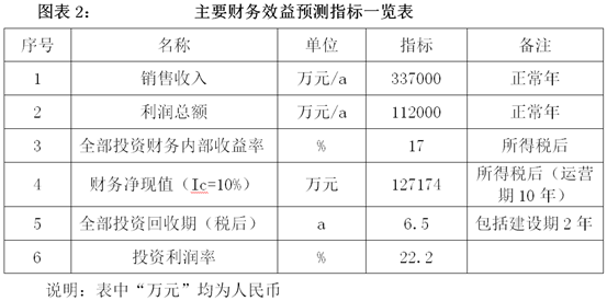 項(xiàng)目達(dá)產(chǎn)后,年銷售收入337000萬元,利潤112000萬元,投資回收期6.5年(稅后,含建設(shè)期2年),投資利潤率22.2%。