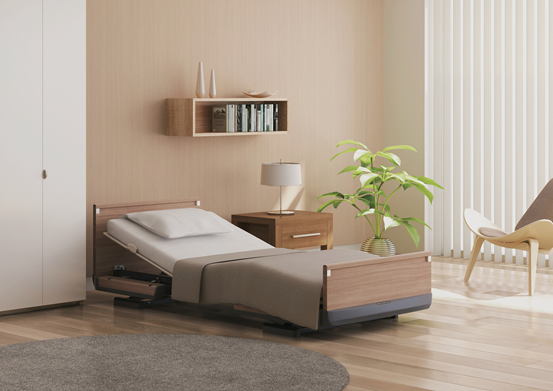 該系列的一個特點是,TA首次在床的側(cè)架上預(yù)留了可選配件的安裝孔。這項"省空間的設(shè)計"能使電動床在安裝護欄、床上桌、點滴架等選配件時,不額外占用床周圍的空間,因此能更好地適應(yīng)日本醫(yī)療設(shè)施相較于歐美更狹小的病房環(huán)境。