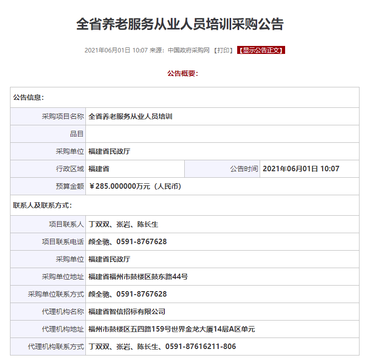 項(xiàng)目名稱:福建省養(yǎng)老服務(wù)從業(yè)人員培訓(xùn)(單一來(lái)源采購(gòu))