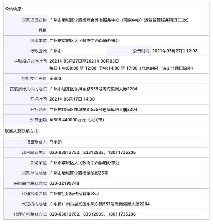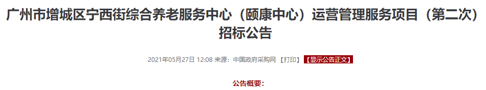 項(xiàng)目名稱:廣州市增城區(qū)寧西街綜合養(yǎng)老服務(wù)中心(頤康中心)運(yùn)營(yíng)管理服務(wù)項(xiàng)目(第二次)招標(biāo)公告