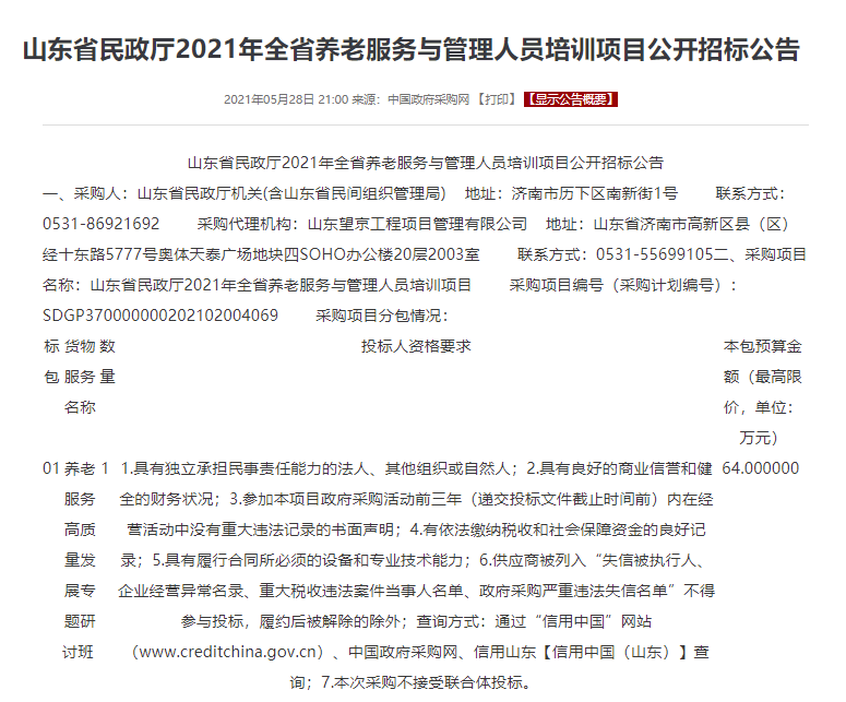 項(xiàng)目名稱:山東省民政廳2021年全省養(yǎng)老服務(wù)與管理人員培訓(xùn)項(xiàng)目