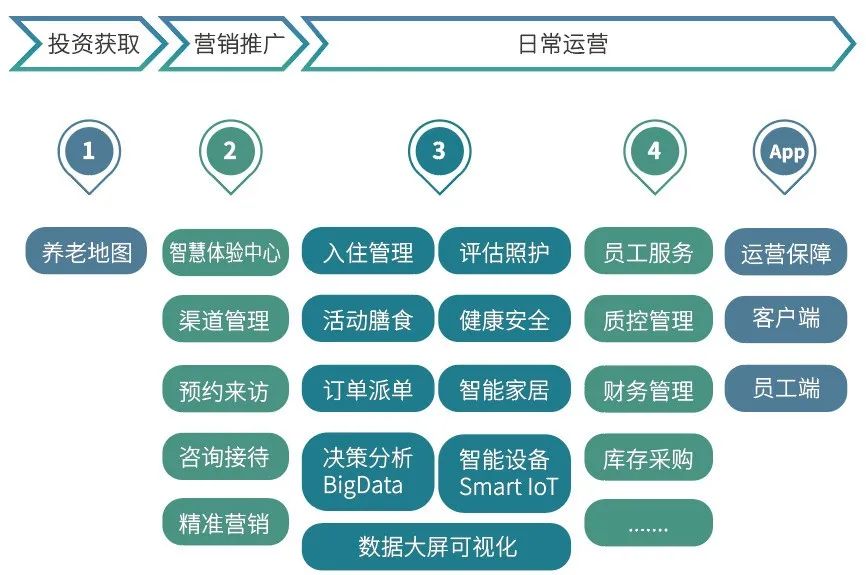 悅享養(yǎng)老運(yùn)營(yíng)平臺(tái)助力機(jī)構(gòu)實(shí)現(xiàn)流程標(biāo)準(zhǔn)化,提供覆蓋投資、營(yíng)銷和運(yùn)營(yíng)全流程的,端到端的解決方案。