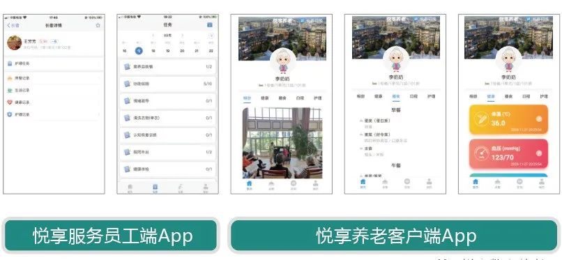 悅享養(yǎng)老員工端App提供對(duì)長(zhǎng)輩的生活、健康和護(hù)理記錄等功能,助力護(hù)理人員高效便捷工作,同時(shí)為員工效能及運(yùn)營(yíng)分析提供有效數(shù)據(jù)來(lái)源。