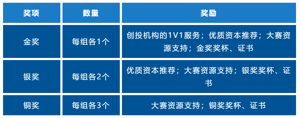 大賽按組別各設(shè)置金、銀、銅獎(jiǎng)。獲獎(jiǎng)項(xiàng)目將獲得由大賽組委會(huì)提供的金融服務(wù)、展示宣傳、獎(jiǎng)杯證書(shū)等資源和獎(jiǎng)勵(lì)。具體如下:
