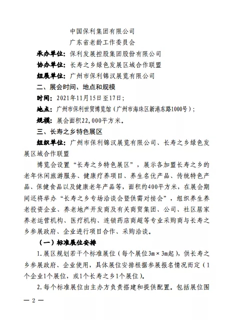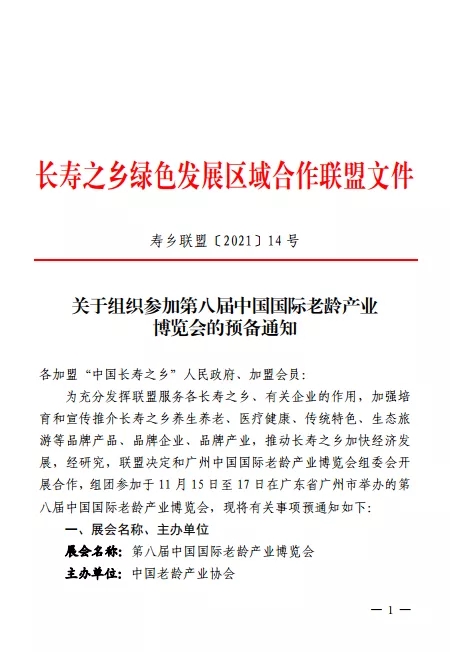 近日,中國(guó)長(zhǎng)壽之鄉(xiāng)綠色發(fā)展區(qū)域合作聯(lián)盟發(fā)布通知,組織長(zhǎng)壽之鄉(xiāng)及相關(guān)企業(yè)參展第八屆SIC老博會(huì)(2021年11月15-17日 · 廣州保利世貿(mào)博覽館),詳情如下: