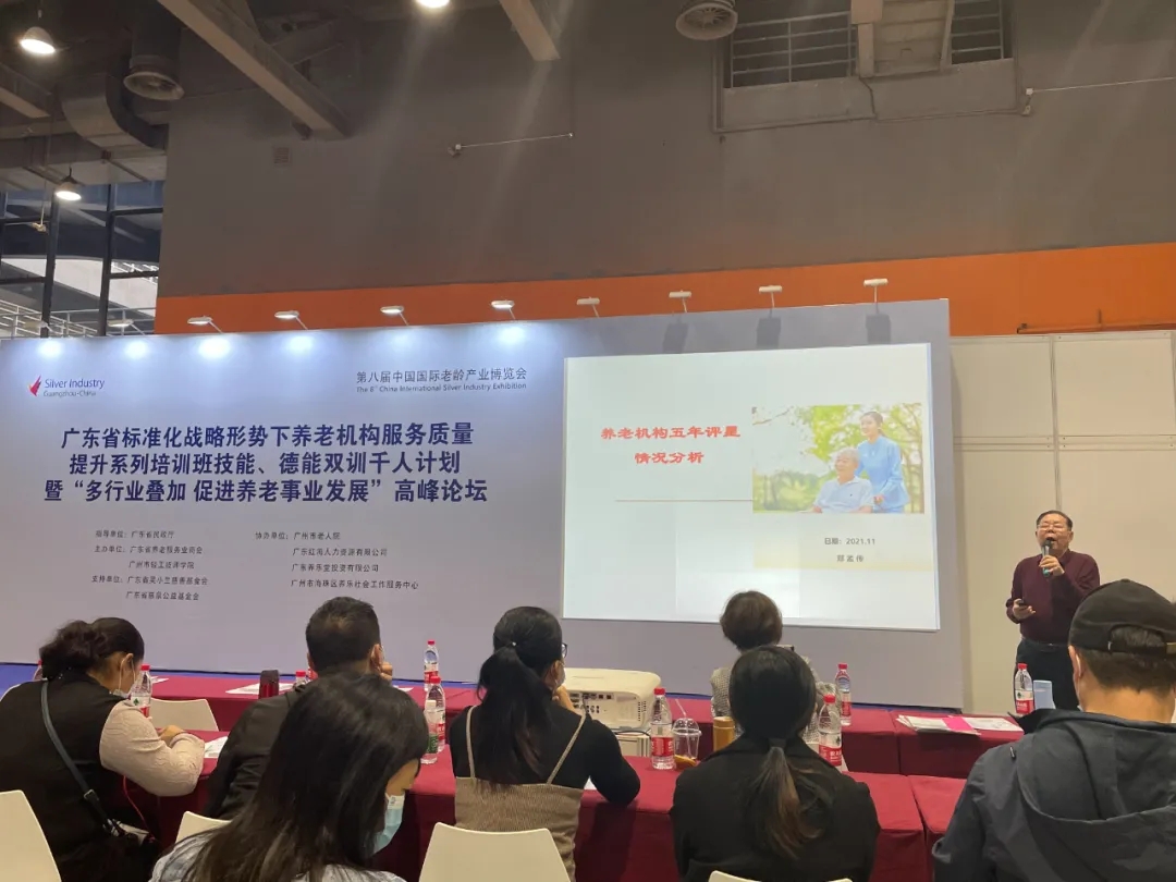 本次培訓是2021年“廣東省標準化戰(zhàn)略形勢下養(yǎng)老機構(gòu)服務(wù)質(zhì)量提升系列培訓班技能、德能雙訓千人計劃”開展的第二期。為期三天的培訓里,安排兩天時間在本次活動主辦方之一:廣東紅海人力資源有限公司進行上課學習,在培訓第三天安排在第八屆中國國際老齡產(chǎn)業(yè)博覽會現(xiàn)場進行,以“上午學習+中午參觀博覽會+下午結(jié)合高端論壇”三結(jié)合形式組合學習。