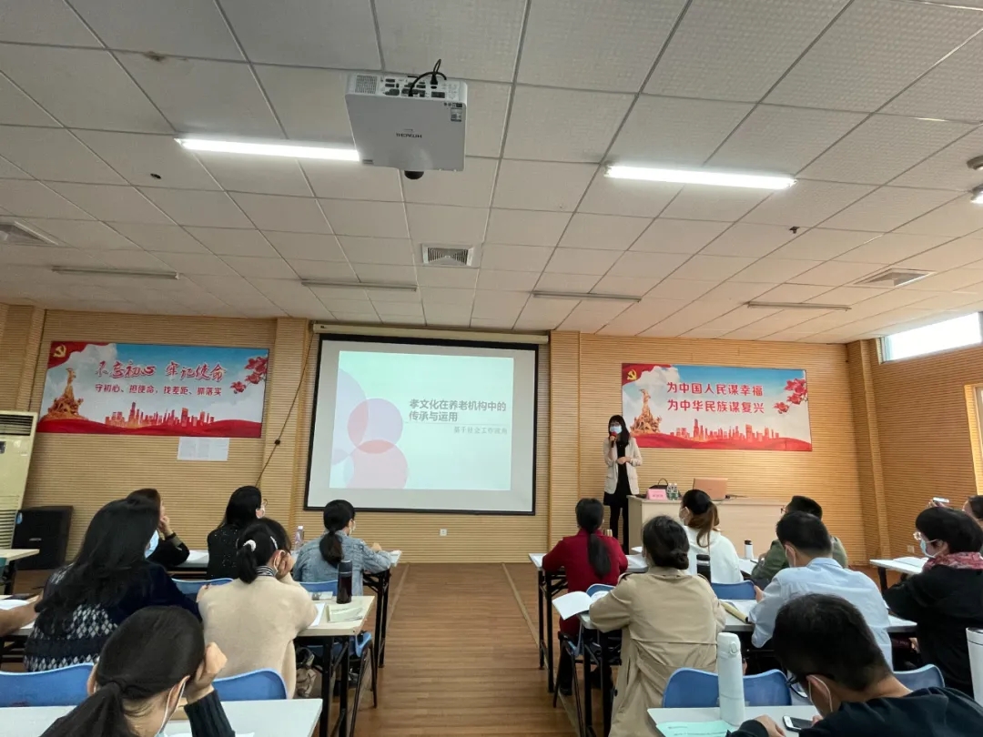 由廣州市老人院社工部部長歐幼冰講授了第一堂課。她講述了“孝”文化的演變傳承、中國孝文化對養(yǎng)老機構(gòu)發(fā)展的重要性,并講述了在孝文化背景下,養(yǎng)老機構(gòu)社工的價值與如何實踐。