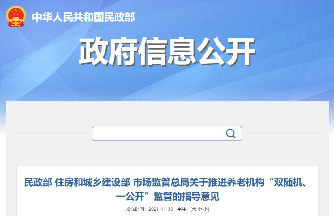 民政部、住房和城鄉(xiāng)建設(shè)部、市場監(jiān)管總局三部門11月30日聯(lián)合出臺《關(guān)于推進養(yǎng)老機構(gòu)“雙隨機、一公開”監(jiān)管的指導(dǎo)意見》,要求積極推進養(yǎng)老機構(gòu)“雙隨機、一公開”監(jiān)管工作,通過隨機抽取檢查對象,隨機選派執(zhí)法檢查人員,抽查情況及查處結(jié)果及時向社會公開,進一步規(guī)范監(jiān)管行為,提高監(jiān)管效能,加強綜合監(jiān)管的法治化、規(guī)范化、常態(tài)化。