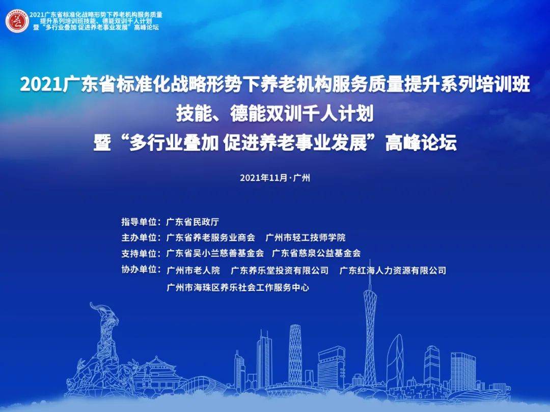 2021年11月16日,2021廣東省標(biāo)準(zhǔn)化戰(zhàn)略形勢(shì)下養(yǎng)老機(jī)構(gòu)服務(wù)質(zhì)量提升系統(tǒng)培訓(xùn)班 技能、德能雙訓(xùn)千人計(jì)劃暨“多行業(yè)疊加 促進(jìn)養(yǎng)老事業(yè)發(fā)展”高峰論壇成功舉辦。