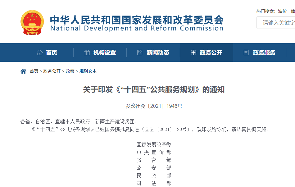 1月10日,國(guó)家發(fā)展和改革委員會(huì)發(fā)布關(guān)于《“十四五”公共服務(wù)規(guī)劃》的通知,此規(guī)劃依據(jù)據(jù)《中華人民共和國(guó)國(guó)民經(jīng)濟(jì)和社會(huì)發(fā)展第十四個(gè)五年規(guī)劃綱要》編制,主要涵蓋幼有所育、學(xué)有所教、勞有所得、病有所醫(yī)、老有所養(yǎng)、住有所居、弱有所扶、優(yōu)軍服務(wù)保障和文體服務(wù)保障等領(lǐng)域的公共服務(wù)。