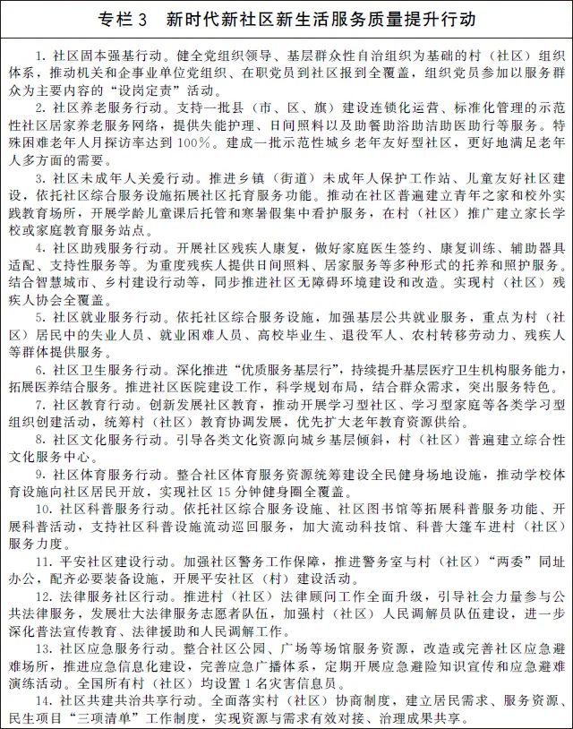 到2025年末,黨建引領(lǐng)社區(qū)服務(wù)體系建設(shè)更加完善,服務(wù)主體和服務(wù)業(yè)態(tài)更加豐富,線(xiàn)上線(xiàn)下服務(wù)機(jī)制更加融合,精準(zhǔn)化、精細(xì)化、智能化水平持續(xù)提升,社區(qū)吸納就業(yè)能力不斷增強(qiáng),基本公共服務(wù)均等化水平明顯提升,人民群眾操心事、煩心事、揪心事更好解決,獲得感、幸福感、安全感不斷增強(qiáng)。
