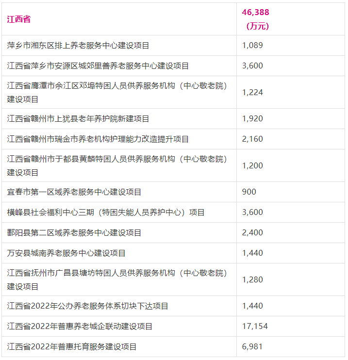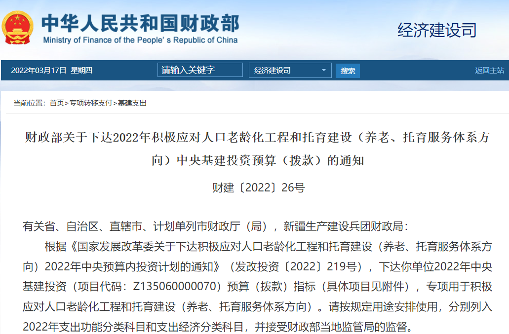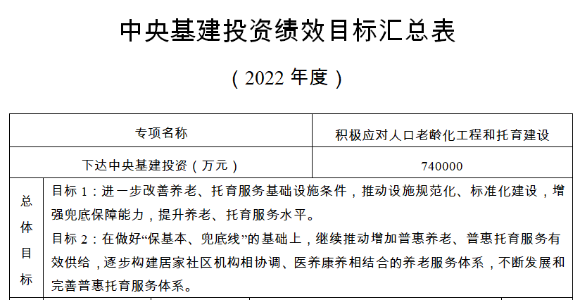 近日,財政部關于下達2022年積極應對人口老齡化工程和托育建設(養(yǎng)老、托育服務體系方向)中央基建投資預算(撥款)的通知,撥款74億元專項用于積極應對人口老齡化工程和托育建設(養(yǎng)老、托育服務體系方向),并公布各省市具體建設項目及撥款金額。