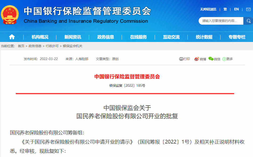 近日,中國銀保監(jiān)會官網(wǎng)發(fā)布《關(guān)于國民養(yǎng)老保險股份有限公司開業(yè)的批復(fù)》(銀保監(jiān)復(fù)〔2022〕185號),同意國民養(yǎng)老保險股份有限公司(簡稱“國民養(yǎng)老”)開業(yè)。記者從國民養(yǎng)老保險獲悉,公司已辦理完工商注冊手續(xù)。至此,從去年批籌以后就備受關(guān)注的養(yǎng)老第三支柱實踐者,將正式啟航。
