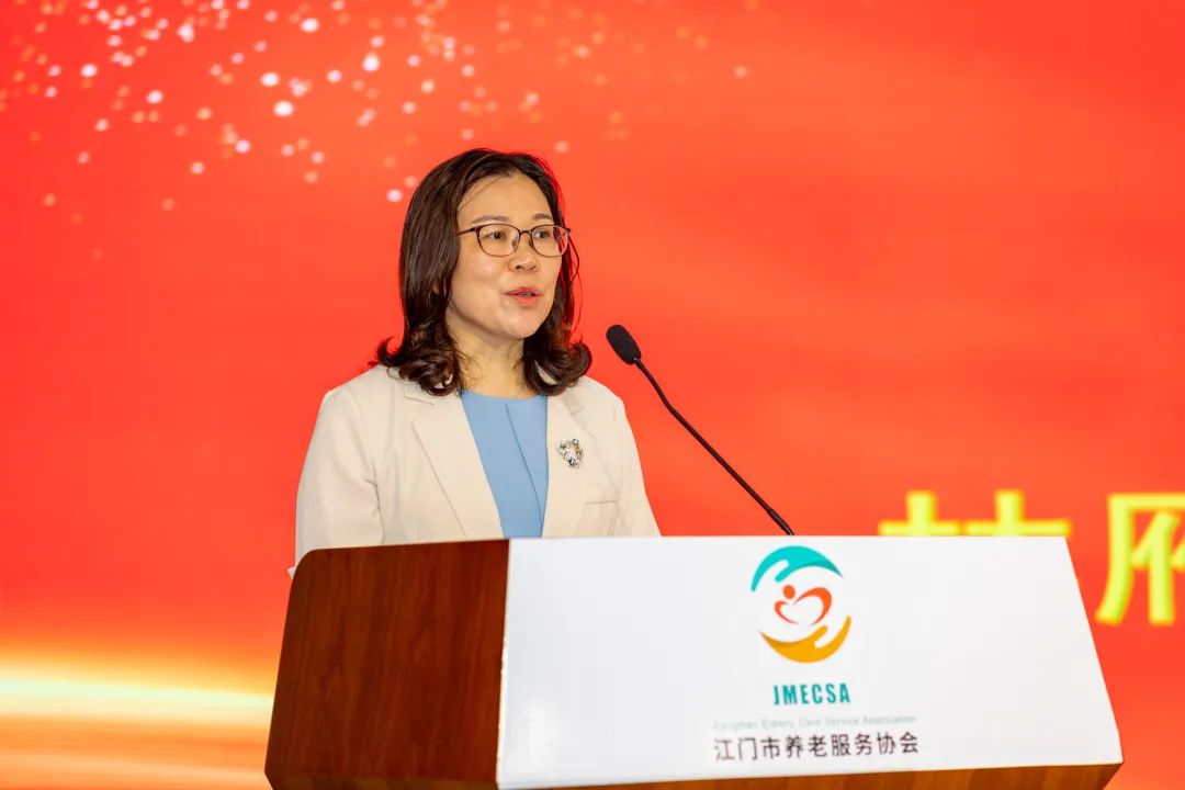 ▲江門市民政局黨組成員、副局長(zhǎng)林雁冰在成立大會(huì)上致辭