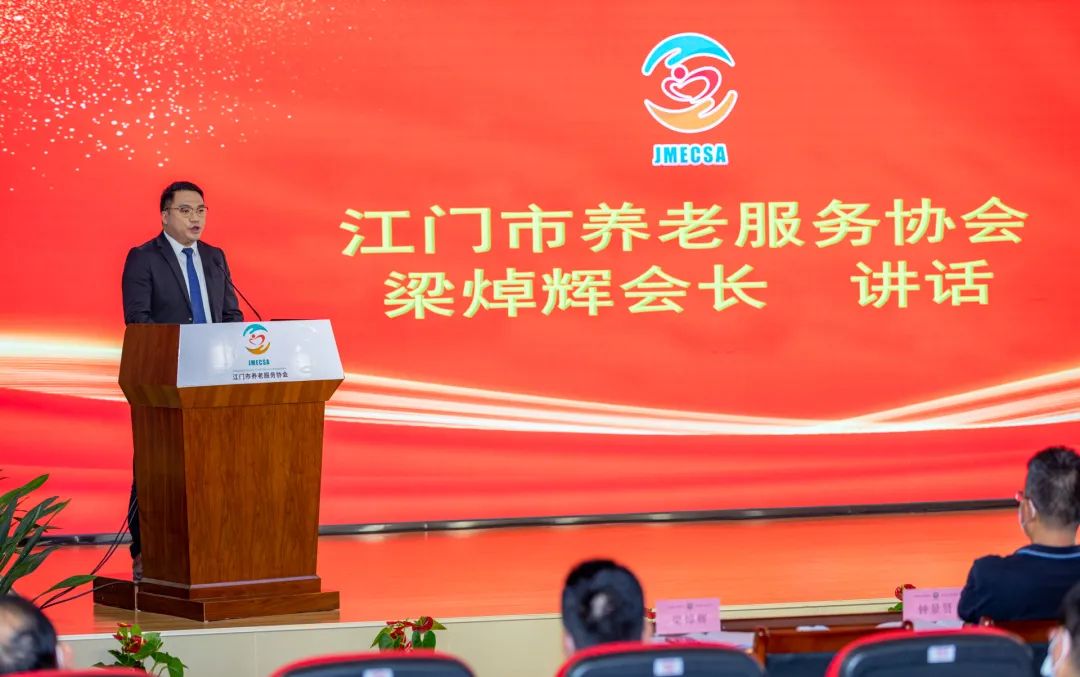 ▲江門市養(yǎng)老服務(wù)協(xié)會(huì)首任會(huì)長(zhǎng)梁焯輝發(fā)表就職講話
