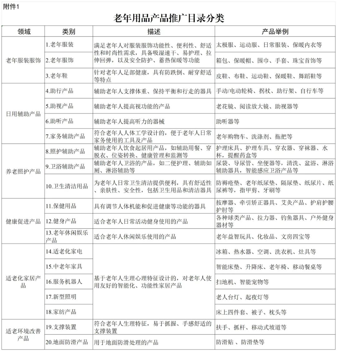 (二)產(chǎn)品范圍。老年服裝服飾、日用輔助產(chǎn)品、養(yǎng)老照護(hù)產(chǎn)品、健康促進(jìn)產(chǎn)品、適老化家居產(chǎn)品、適老環(huán)境改善產(chǎn)品等6大領(lǐng)域20個品類。