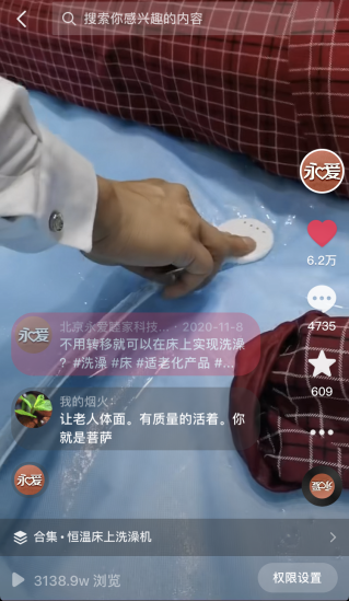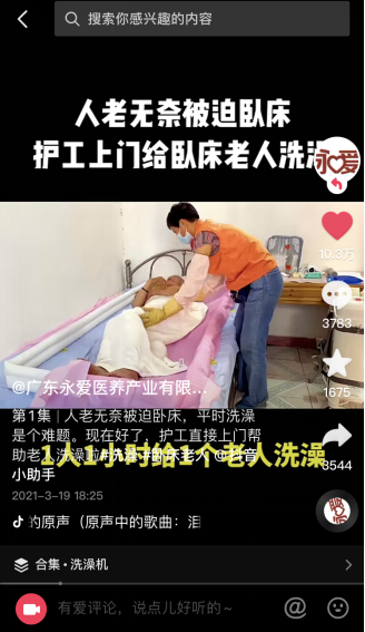 新冠疫情爆發(fā)后,傳統(tǒng)渠道受到?jīng)_擊,線上營銷如火如荼,電商網(wǎng)店、直播帶貨成為產(chǎn)品推廣的重要渠道之一。永愛順勢而為,在2020年的SIC老博會上推出了一款針對失能、半失能臥床老人的洗澡機,并發(fā)布在抖音上,獲得了超3000萬瀏覽量。得益于這一“爆款”產(chǎn)品,永愛的直播間逐漸從“門可羅雀”到“門庭若市”,越來越多的C端消費者了解到永愛。