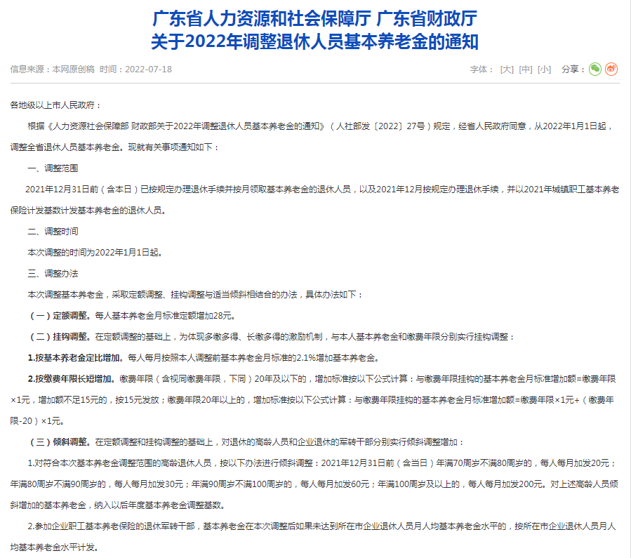 廣東2022年調(diào)整退休人員基本養(yǎng)老金的通知,來自廣東人社廳網(wǎng)站