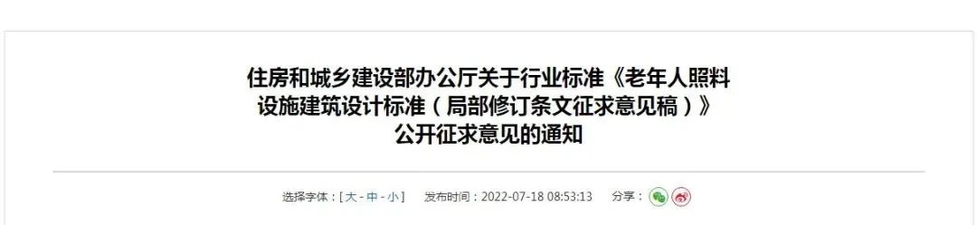 住建部就《老年人照料設(shè)施建筑設(shè)計(jì)標(biāo)準(zhǔn)》局部修訂公開征求意見